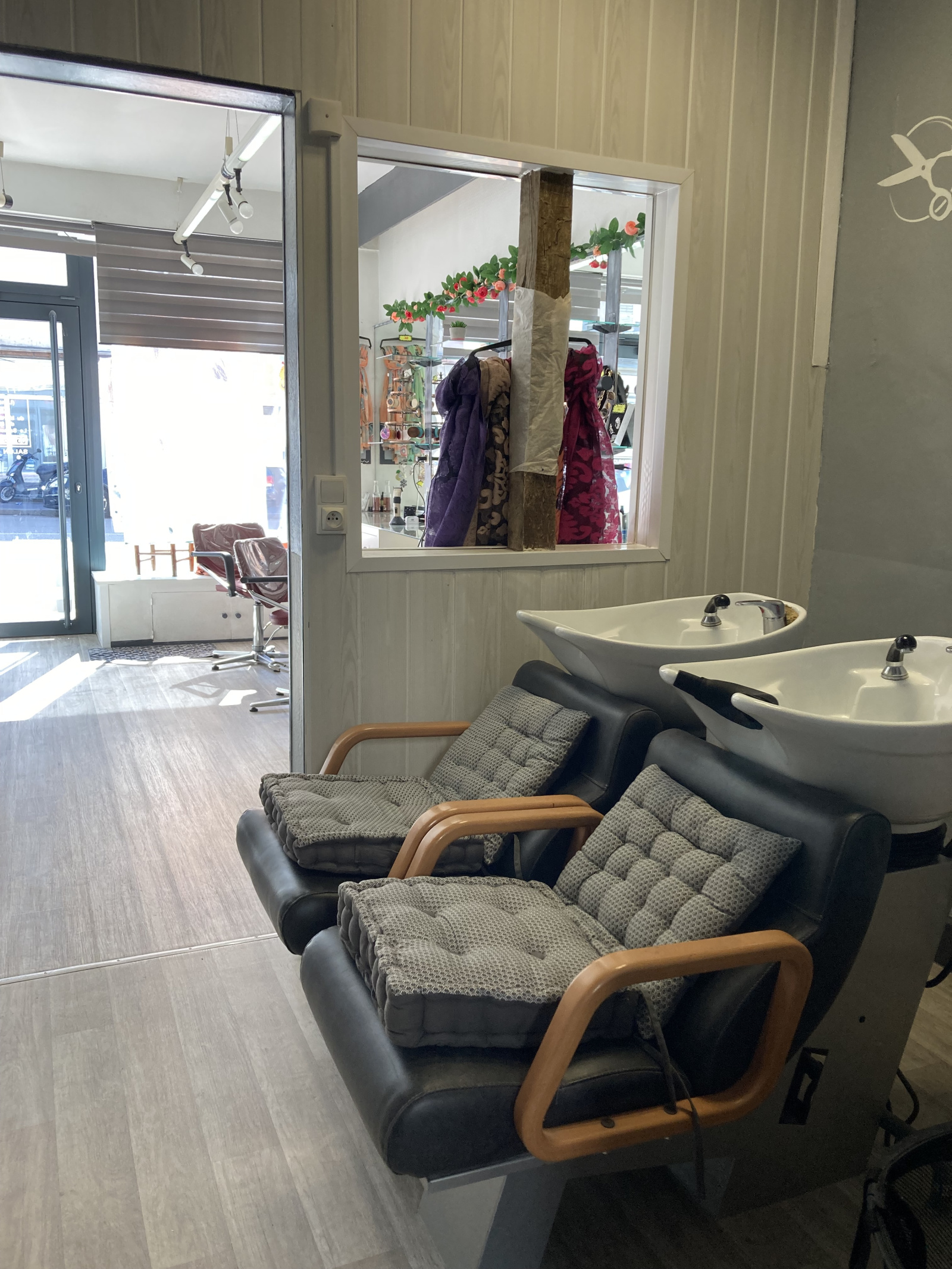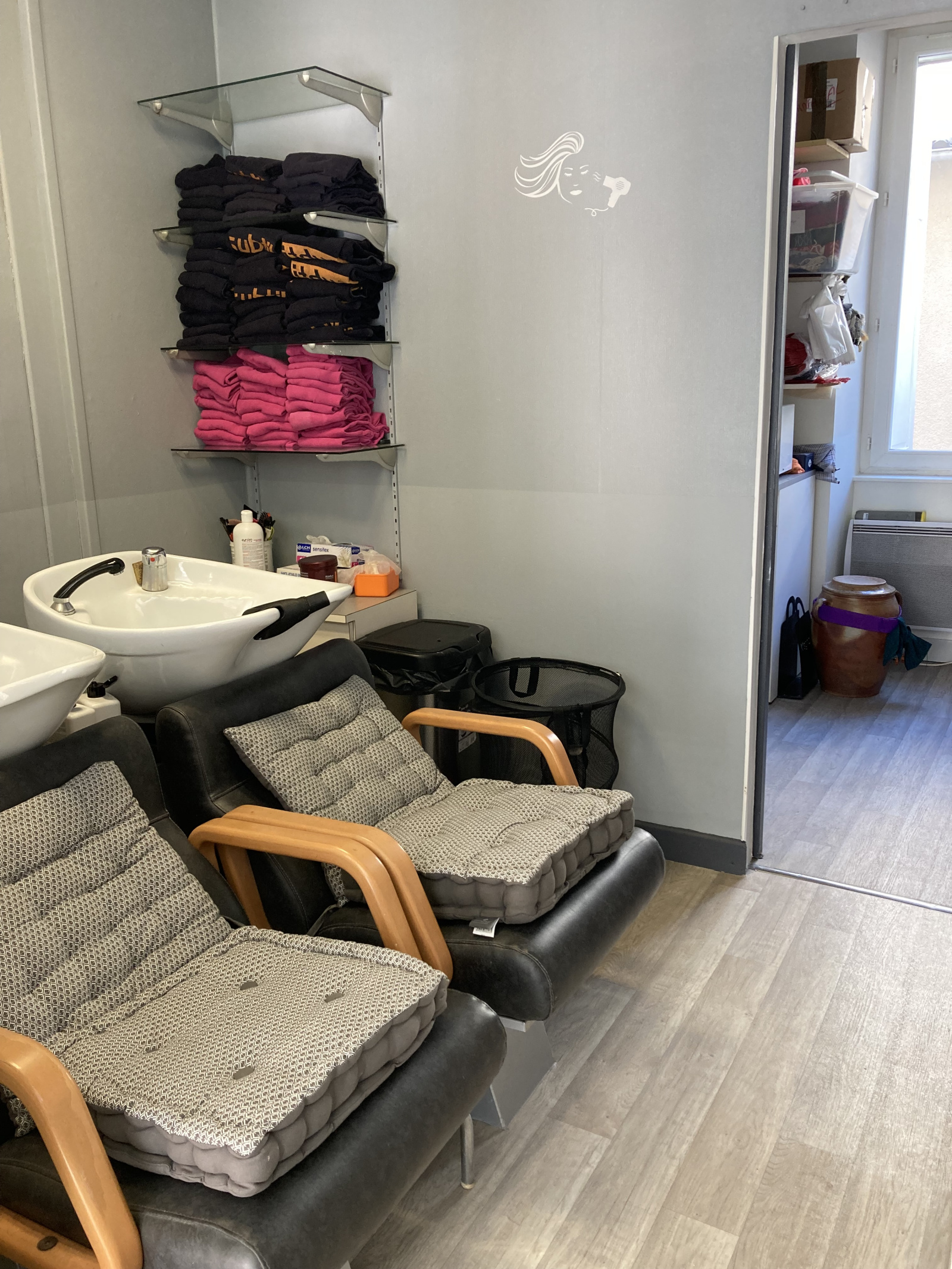 Présence de 2 bacs pour shampoing + 3 postes de travail.