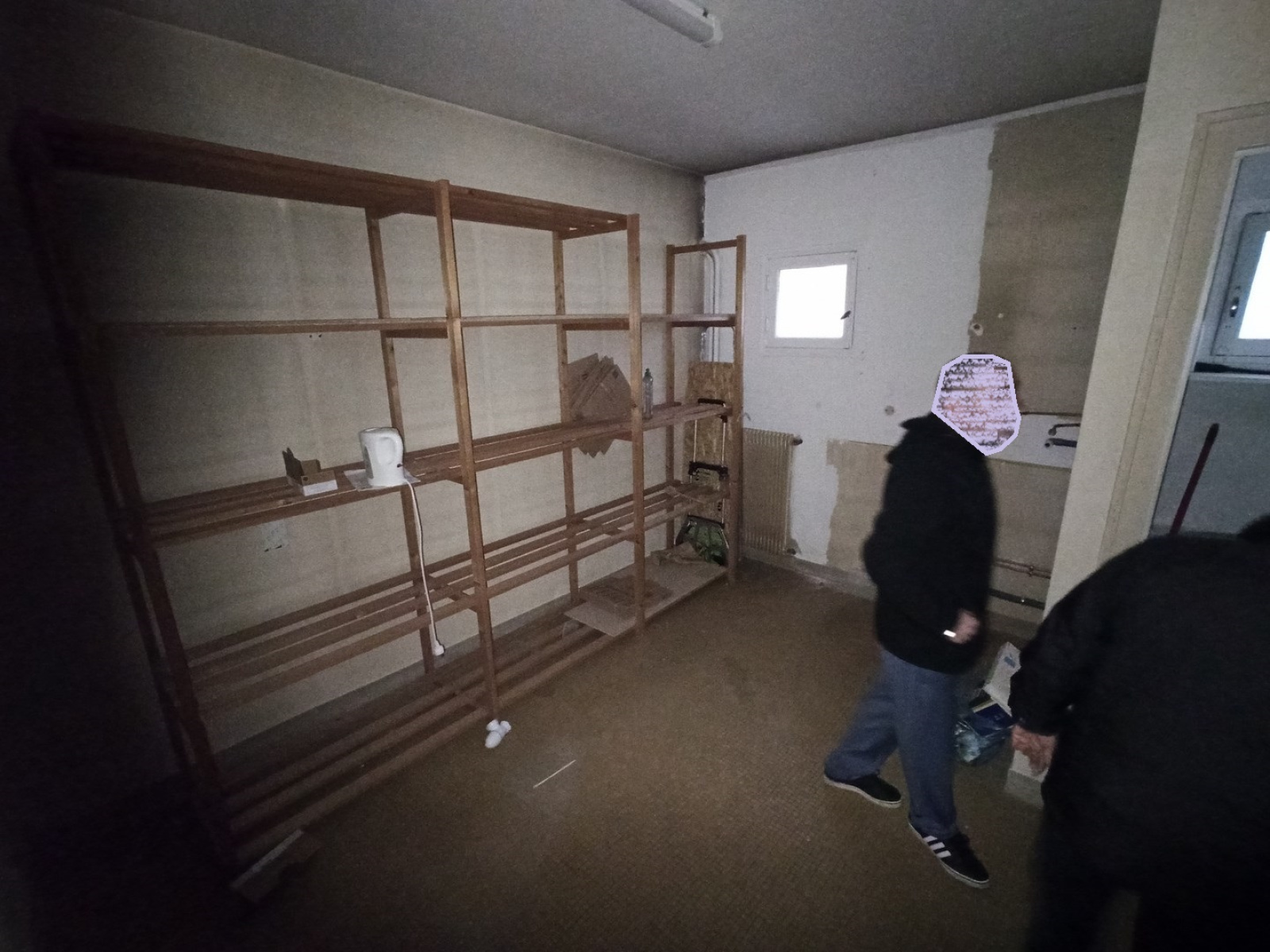 2°) D'un Local type "Réserve/Bureau" de +/-12m² en RDC accessible par les communs. Barreaux aux fenêtres, WC/Lavabo, Arrivée /Évacuation d'eau pour machine à laver, Étagères.